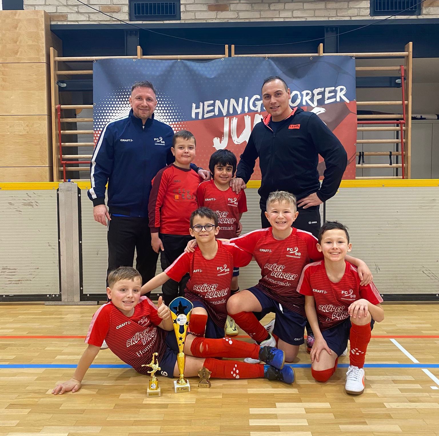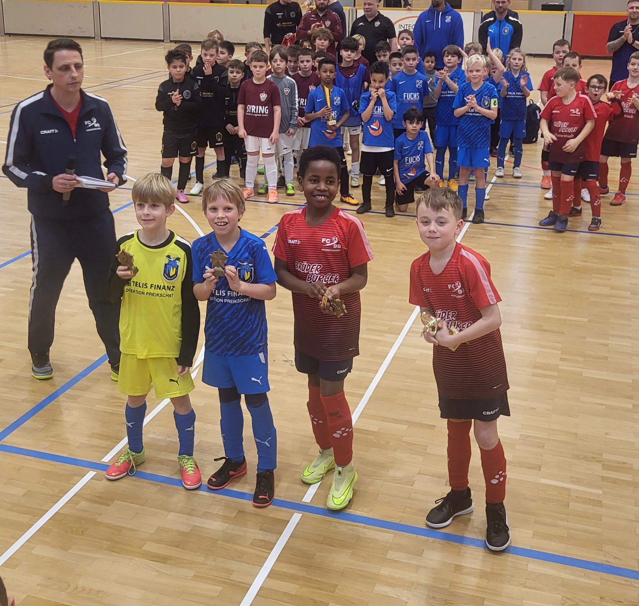 Am Vormittag reisten unsere Gäste aus Velten, Glienicke, Borgsdorf, Hohen Neuendorf und Oranienburg an. Von Beginn an herrschte eine tolle, faire Atmosphäre in der Halle. Die Zuschauer sahen begeisternden Kinderfußball mit schönen Spielzügen, großem Einsatz und echtem Teamgeist. Unsere U9 brauchte im ersten Spiel gegen Velten noch etwas Anlaufzeit und kam nicht über ein 0:0 hinaus. Doch danach war der Knoten geplatzt: Mit Leidenschaft, Spielfreude und beeindruckender Konsequenz folgten Siege gegen Glienicke (4:1), Hohen Neuendorf (2:0), Borgsdorf (6:0) und Oranienburg (8:0). Am Ende stand ein hochverdienter Turniersieg – mit nur einem einzigen Gegentor! Gekrönt wurde diese starke Leistung durch individuelle Auszeichnungen: Fiete wurde als bester Torhüter und Mika mit 5 Treffern als bester Torschütze ins Allstar-Team gewählt.