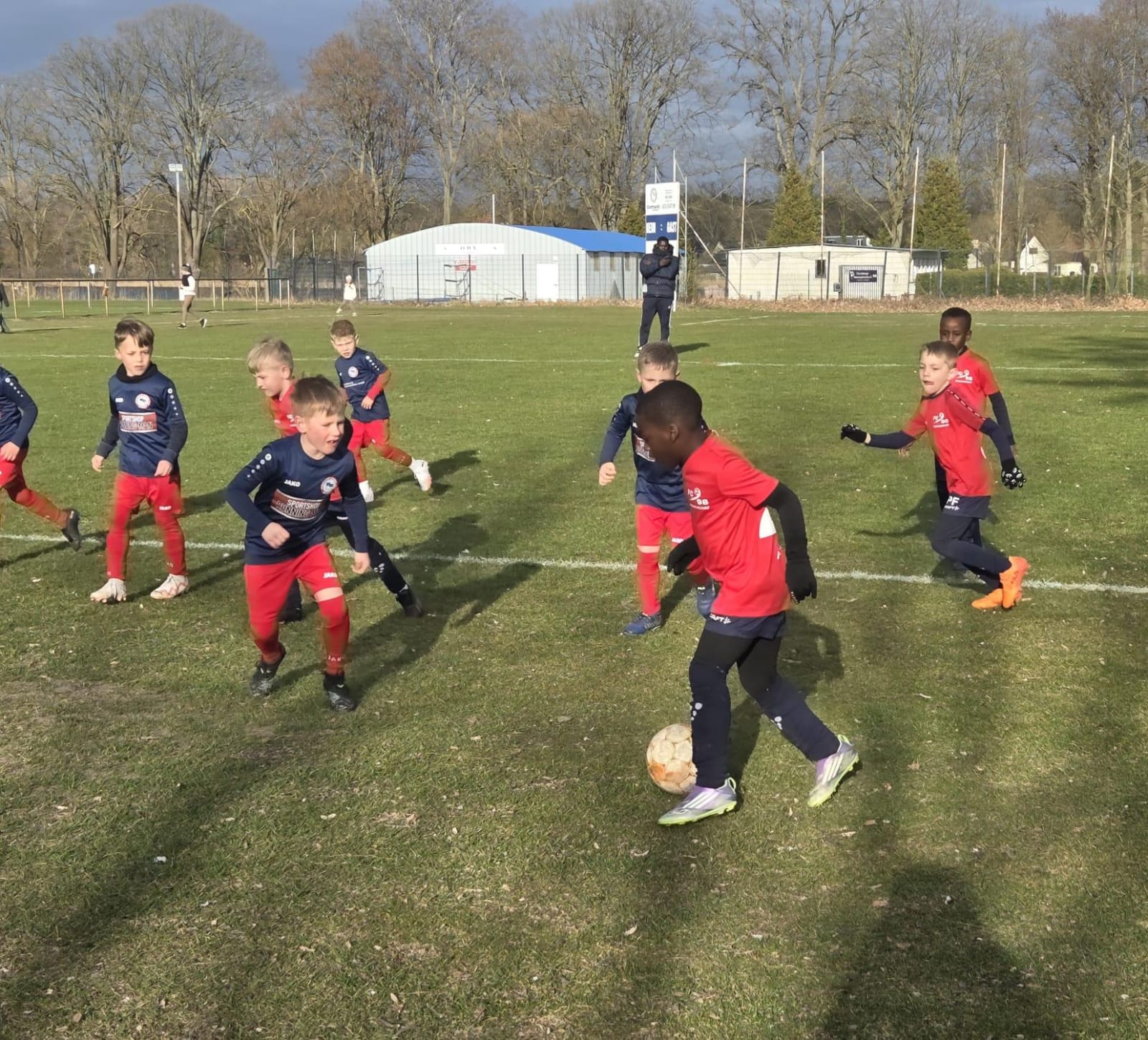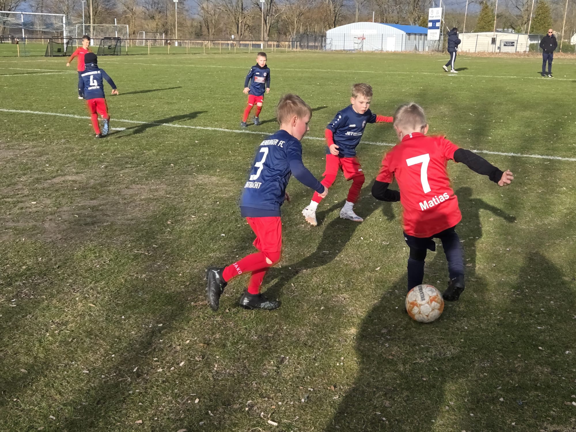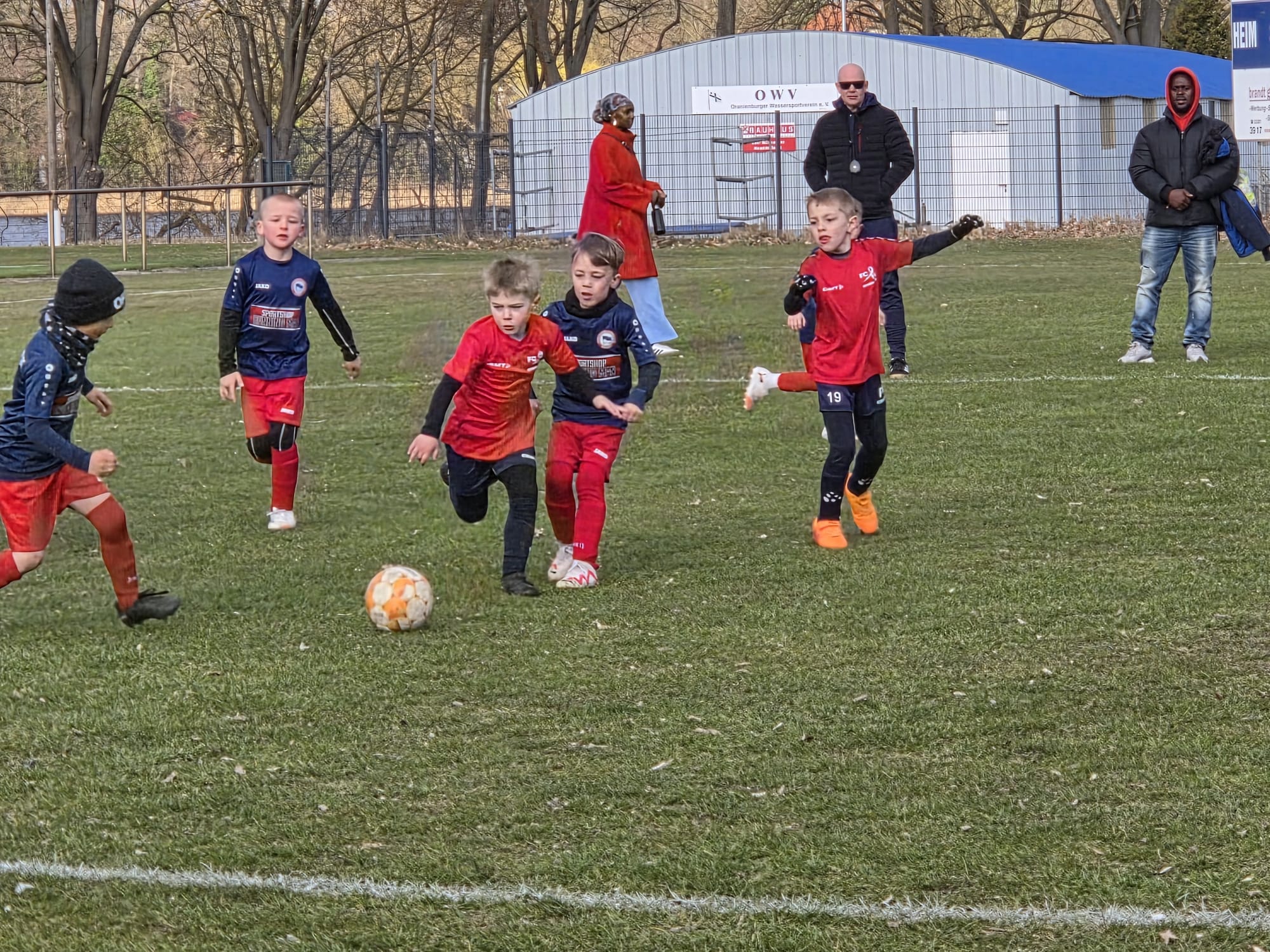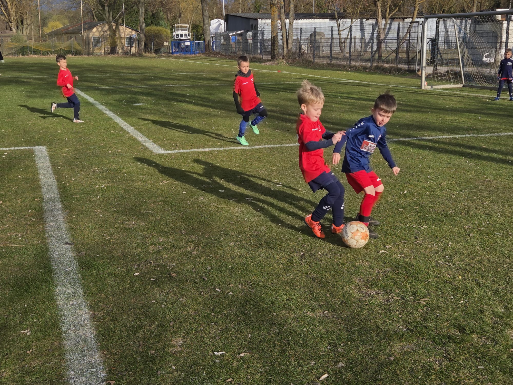 Unsere U7 sowie die U7 aus Oranienburg spielten das erste Mal auf einem größeren Feld mit Jugendtoren zu "Spielbedingungen". Dabei konnte anfangs noch oft eine "Rudelbildung" um den Ball und gemeinsames Laufen nach vorn und hinten beobachtet werden. Aber auch viele tolle Pässe und Torabschlüsse, welche teils sensationell vom Oranienburger Torhüter entschärft wurden. Das Ergebnis ist am Ende nebensächlich, auch wenn wir den Vergleich für uns entscheiden konnten, zeigten alle Spieler vor allem Spaß am Fußball und spielten sogar nach dem Spiel noch in gemischten Teams weiter. Das war toll zu erleben, wir kommen sehr gern wieder. Ein Extralob haben sich Jannis, Aaron und Matias verdient. Jannis als starker Spielmacher, Matias als Toptorjäger und Aaron als Abwehrspezialist.