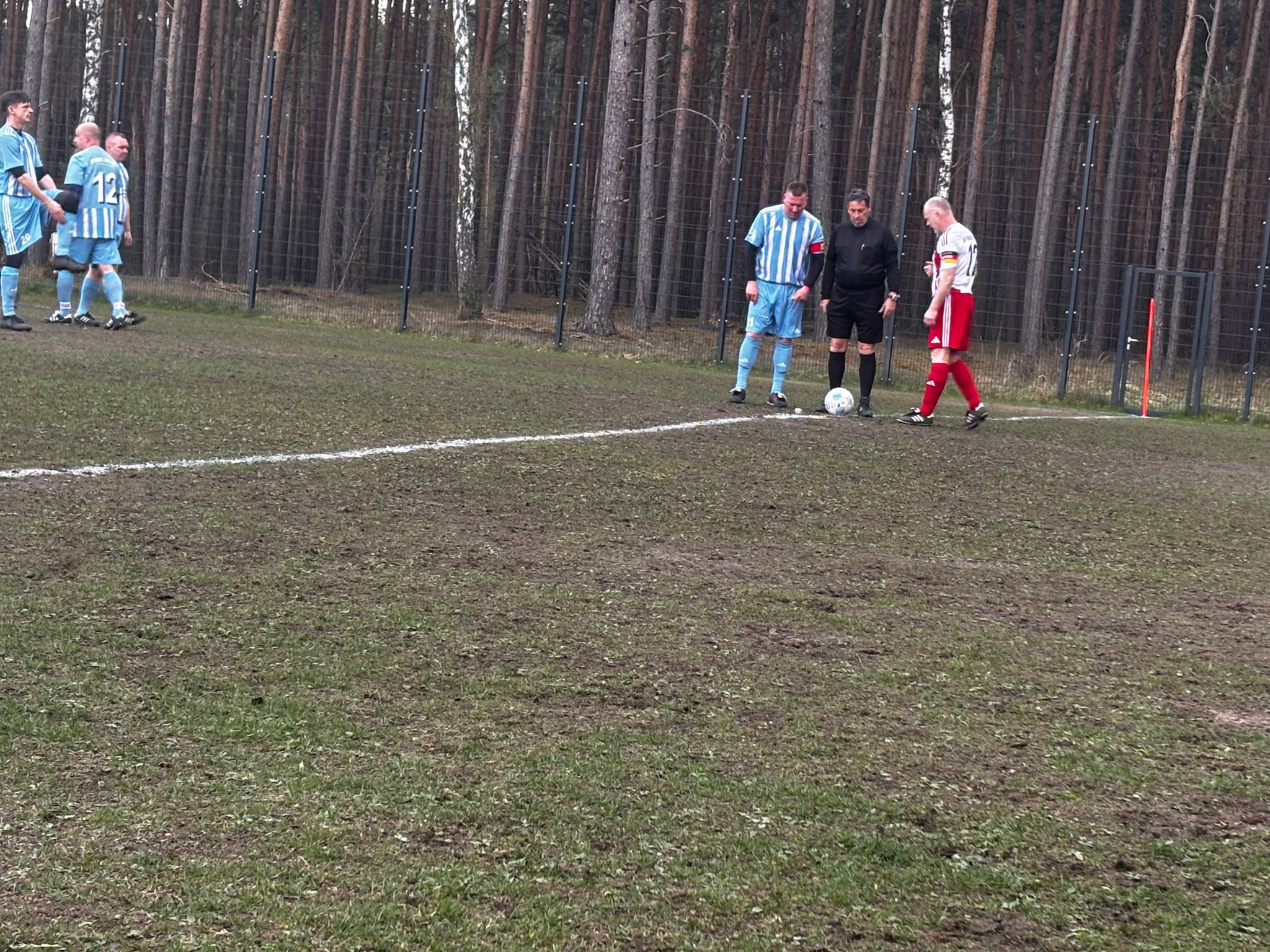 So konnte die Truppe um Spieltagskapitän Heini beim Warmmachen bereits erleben, dass fehlender Rasen, vielzählige Huckel und derbe Matschzonen „richtigen“ Fußball erschweren sollten. Doch auch die Hausherren mussten mit diesen Bedingungen leben und so nahmen alle die Herausforderung an.