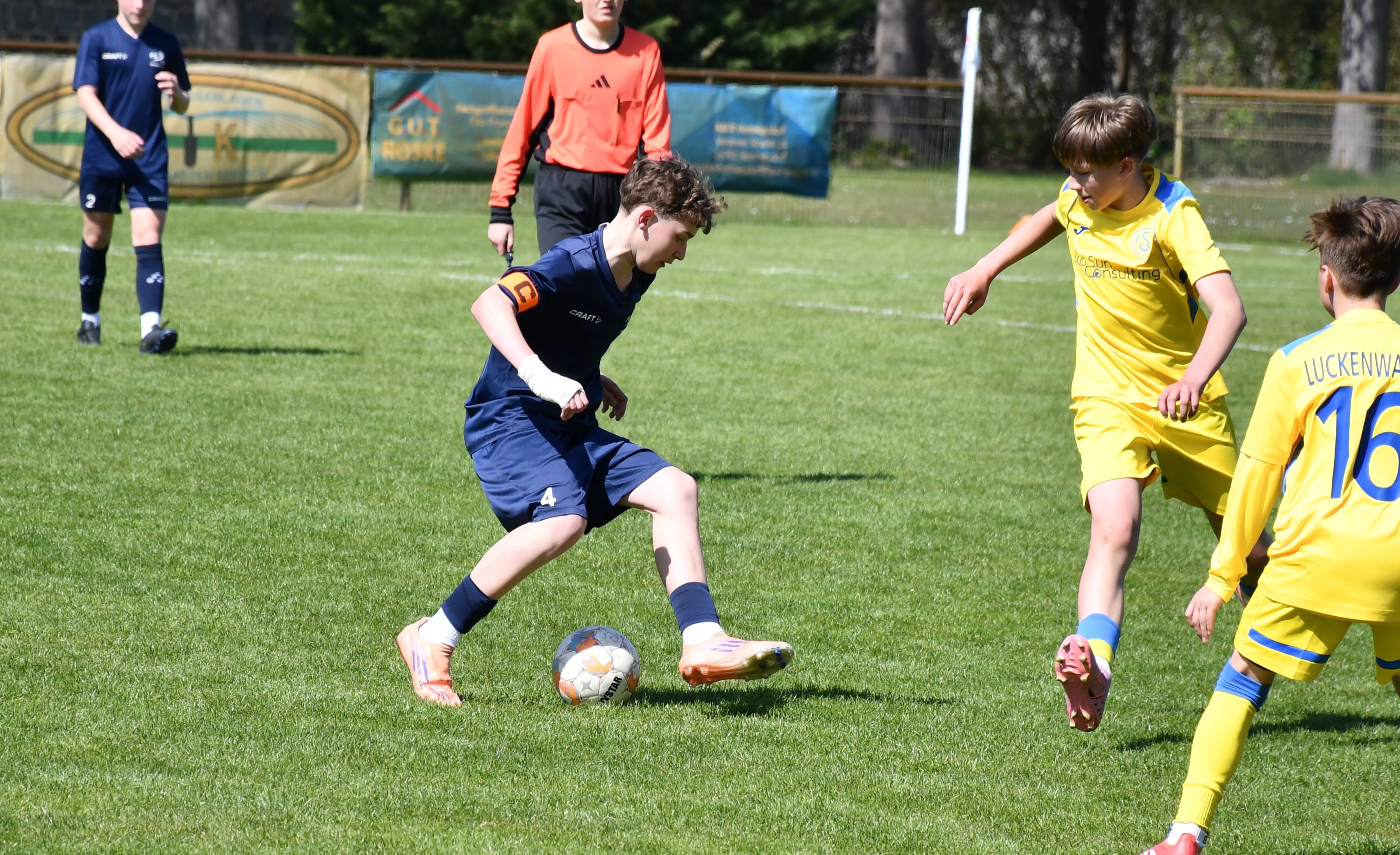 Im dritten Viertel wurde es für Team 1 deutlich schwieriger: Luckenwalde verteidigte kompakt und machte den Raum um den eigenen Strafraum konsequent dicht, sodass trotz großer Überlegenheit kein Treffer gelang – das Viertel endete somit unglücklich 0:0. Team 2 lieferte sich ein ausgeglichenes Spiel, ging früh in Führung, musste jedoch noch den Ausgleich zum 1:1 hinnehmen.